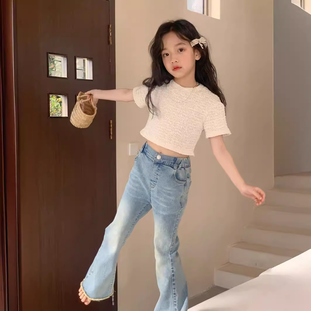 | nameOriginal | Denim flared pants 2024 spring and summer medium and large Children girls retro Hong Kong style elastic frayed elastic waist trousers fashion |
