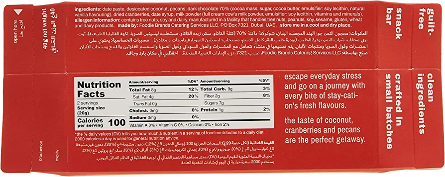 Introducing the Snack Studio Stay-Cation bar, the perfect healthy and natural snack to satisfy your cravings! Each pack contains a single 40g bar, packed with wholesome ingredients that will keep you energized throughout the day. Made with only the finest natural ingredients, this bar is the perfect choice for anyone looking for a healthy snack option. Whether you’re on-the-go or simply need a quick pick-me-up, the Snack Studio Stay-Cation bar is the perfect choice. So why wait? Treat yourself to a delicious and nutritious snack today!