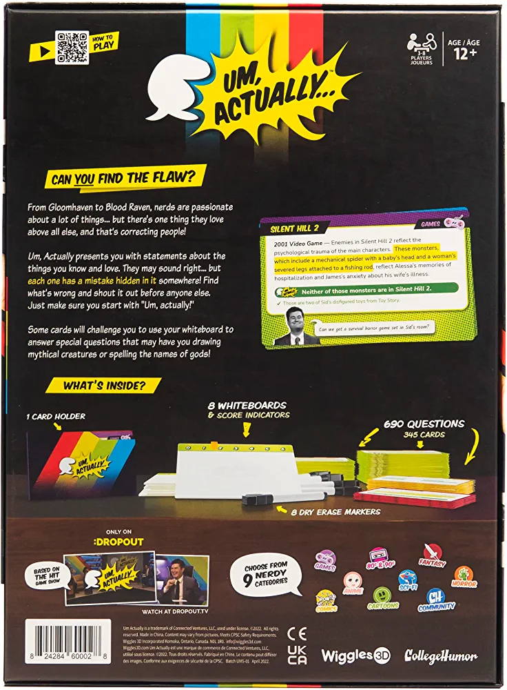 | nameOriginal | Um, Actually Deluxe Edition Board Game, The Nerdy Trivia Game Based on The Dropout Game Show, for Families Ages 12 & up, 3-8 Players, by Wiggles 3D |