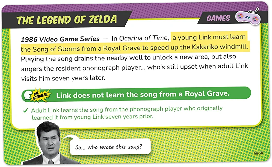 | descriptionOriginal | Description Nerds are passionate about a lot of things… but there's one thing they love above all else, and that's correcting people! Um, Actually presents you with statements about the fictional worlds of popular movies, TV shows and books. They all sound right… but listen carefully, because each one has a mistake hidden in it somewhere! Figure out what's wrong and announce it before anyone else, starting, of course, with the magic phrase: "Um, actually…" In this game based on CollegeHumor's hit game show, you'll find yourself making wild guesses, stumbling into answers, and having laughs along the way! |