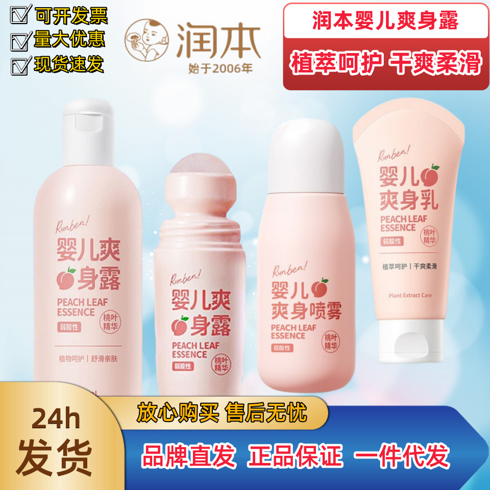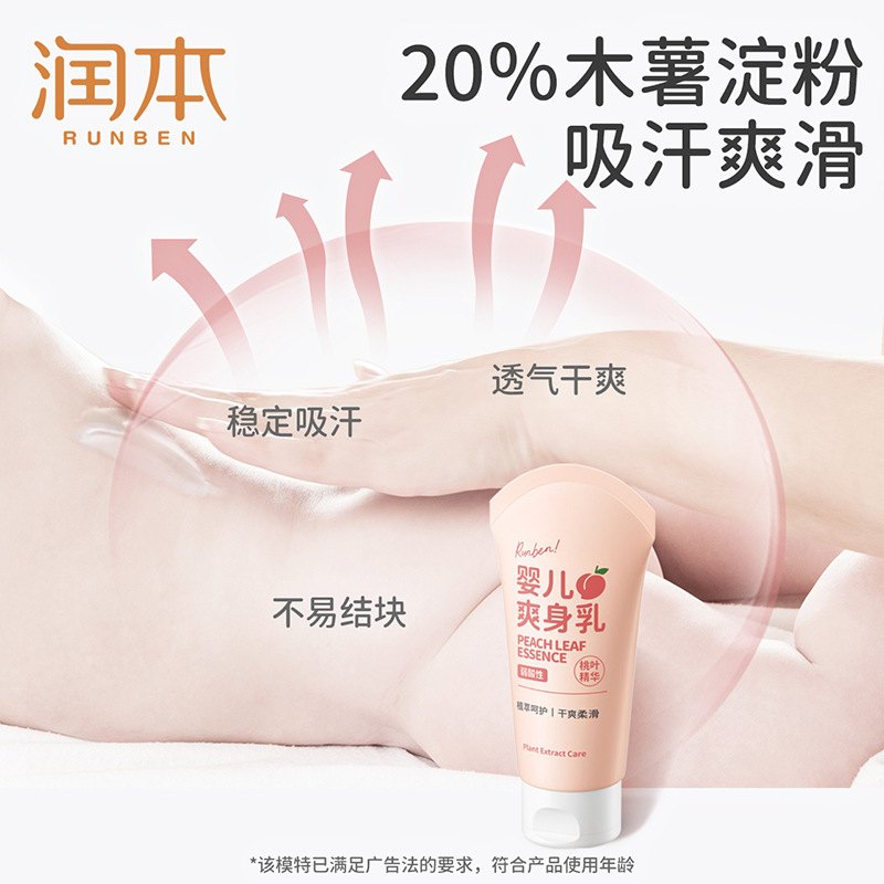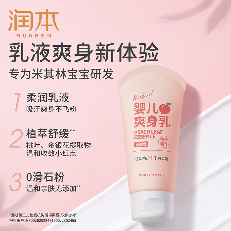 | nameOriginal | Runben Liquid talcum powder for newborn baby body cream Peach leaf essence natural sweat absorption body |
