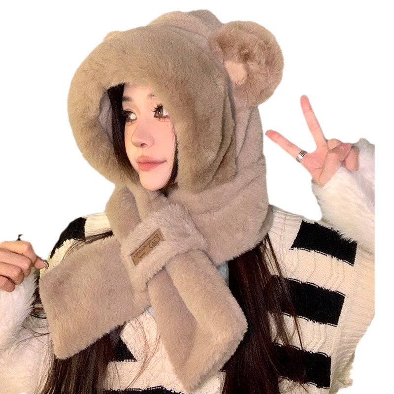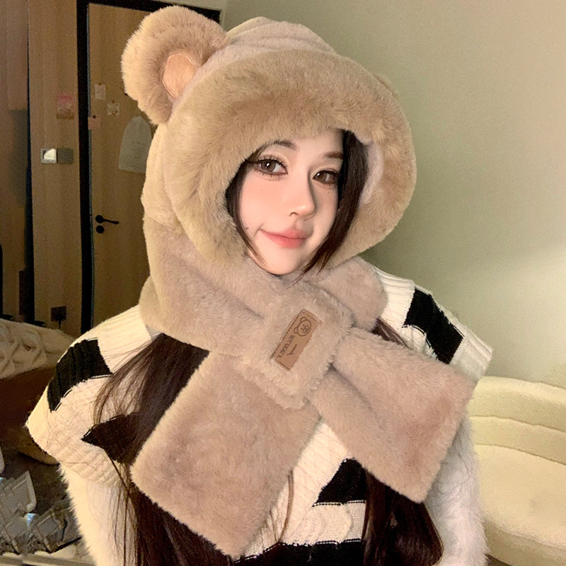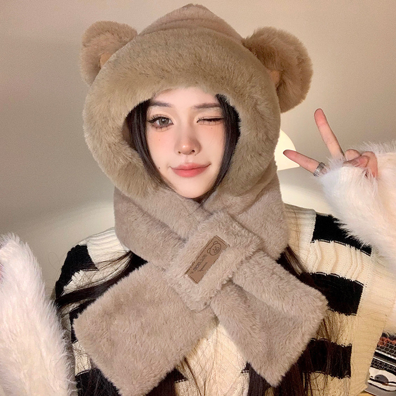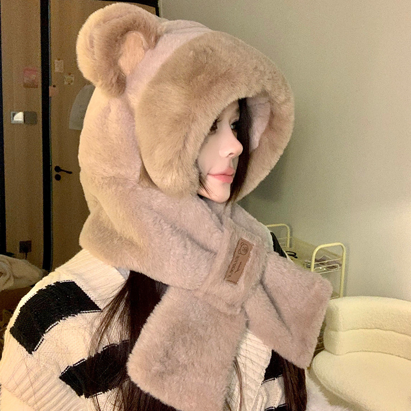 | nameOriginal | Plush bear hat scarf integrated women's winter 2023 autumn and winter new warm windproof cold-proof cycling scarf |