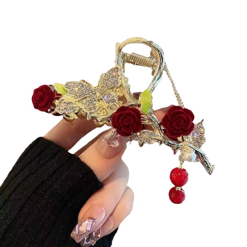 | nameOriginal | Antique Red Rose Tassel Hairpin Women's High Color Value Disc Hair Twist Clip Grab Clip Back Head Shark Clip Balls Clip |