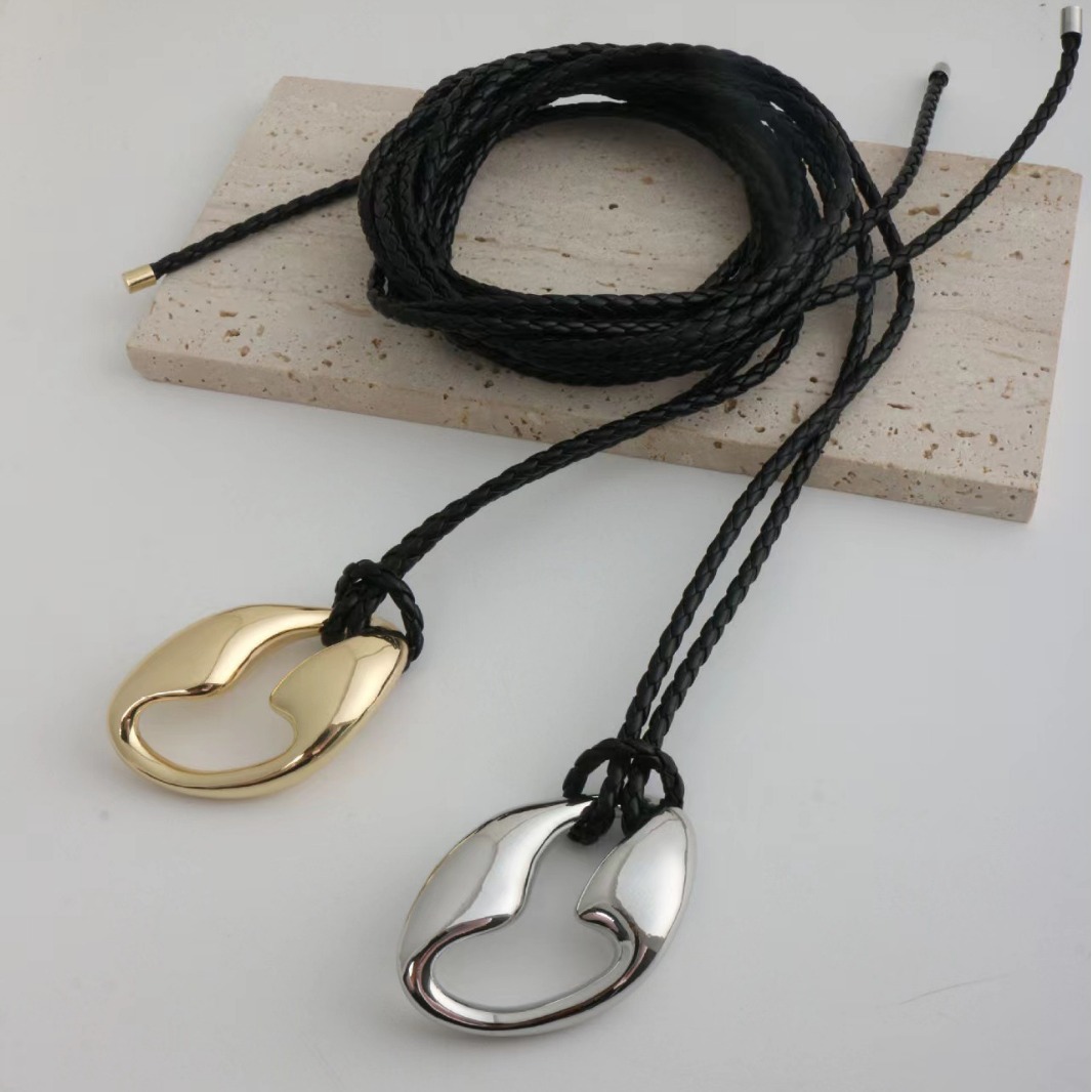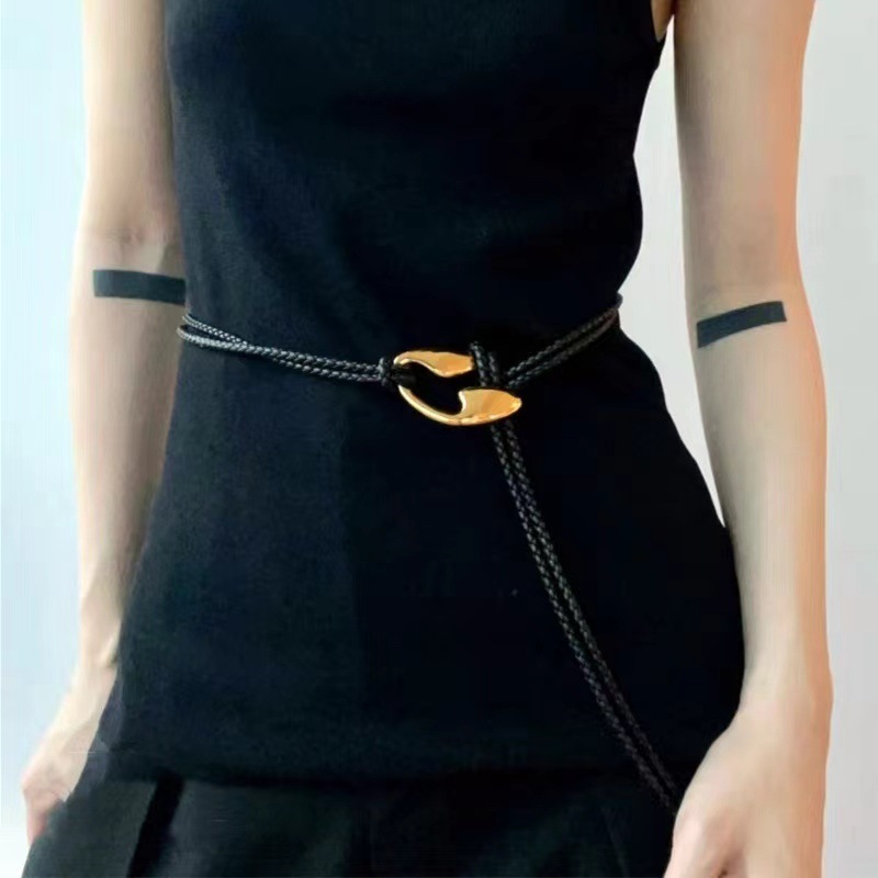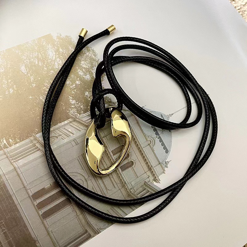 | nameOriginal | Niche design Maillard golden hollow metal woven knotted leather rope waist chain simple fashion autumn and winter coat chain |