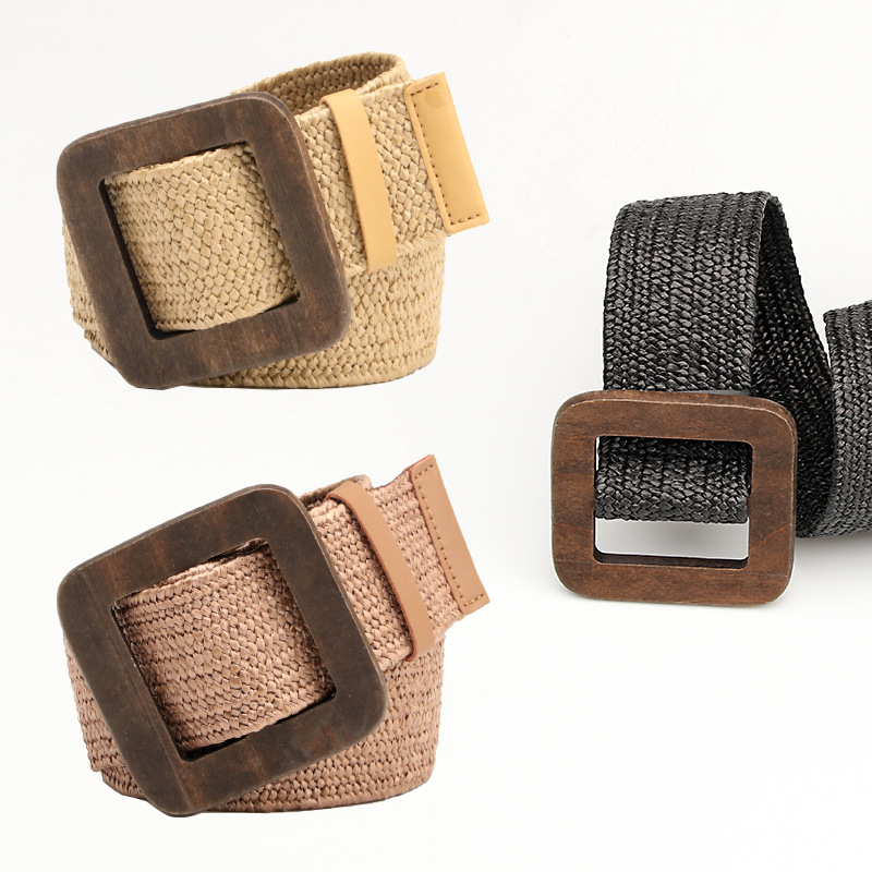 Belt women’s fashion woven round wooden buckle retro simple belt pp grass summer waist decoration bohemian style