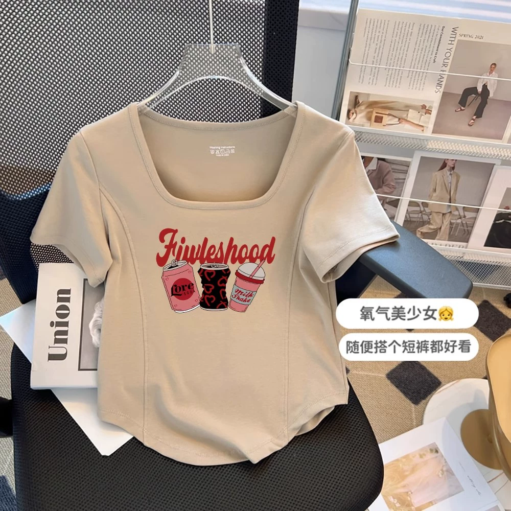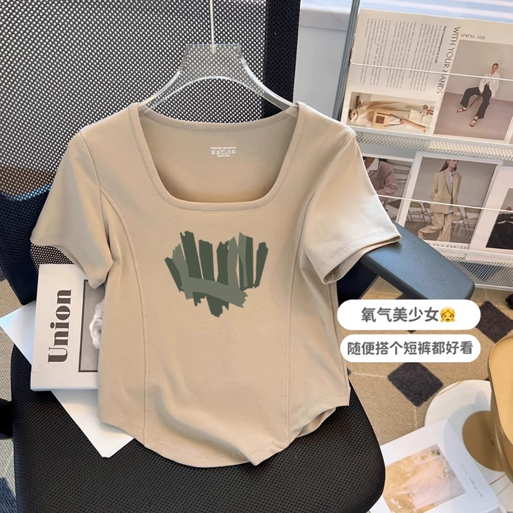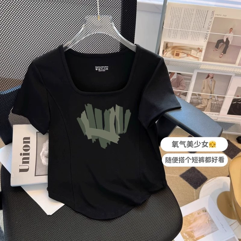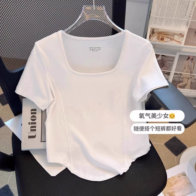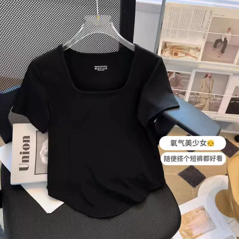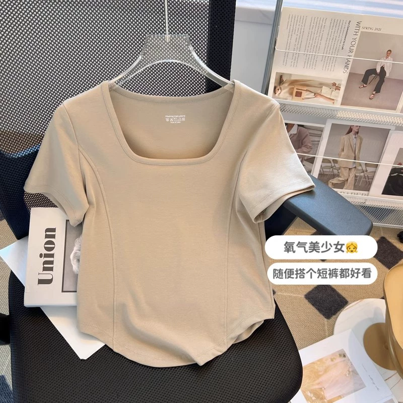 | nameOriginal | Fashionable square collar exposed collarbone waist ins short sleeve t-shirt |