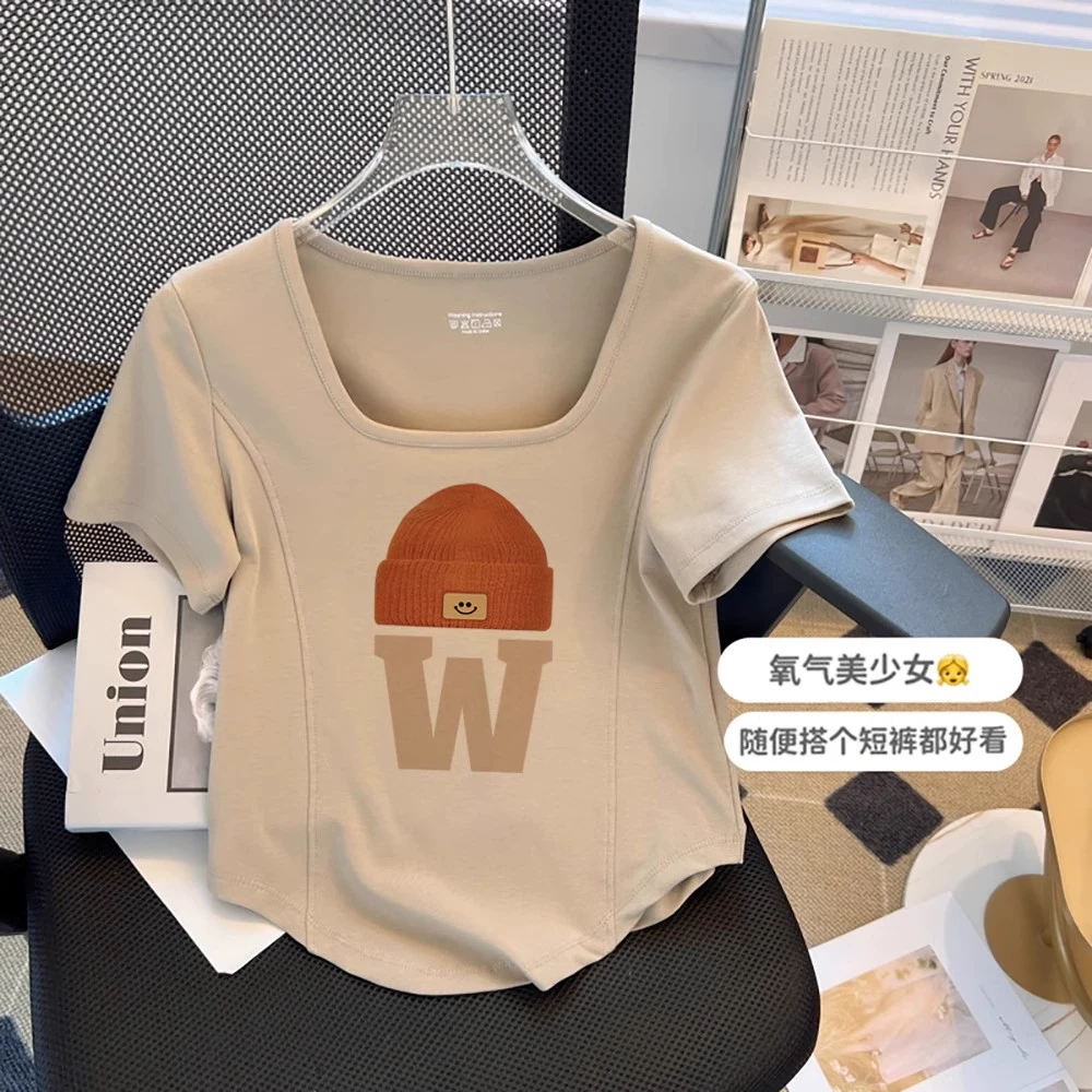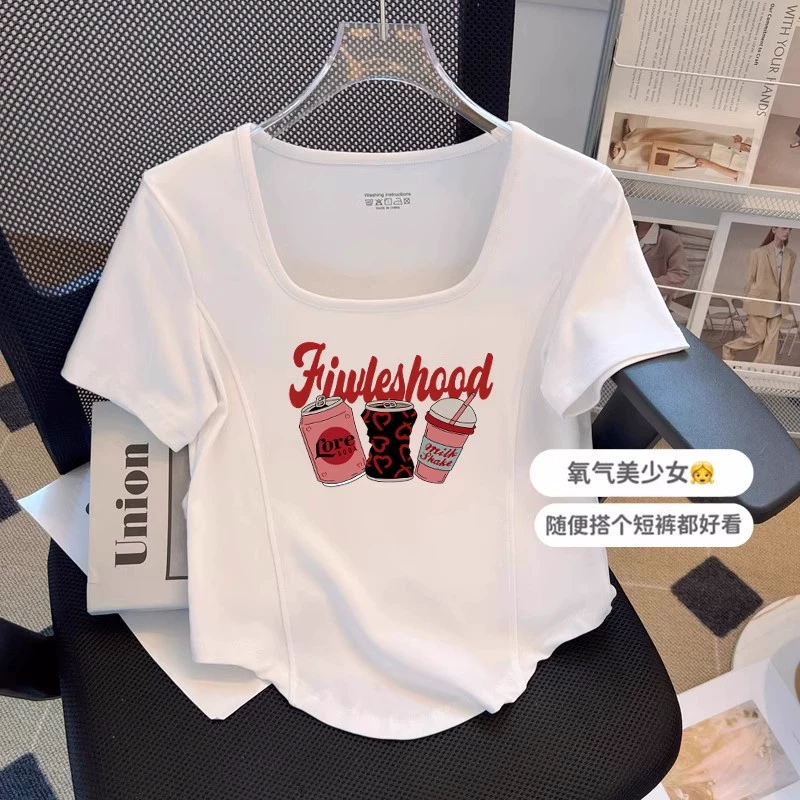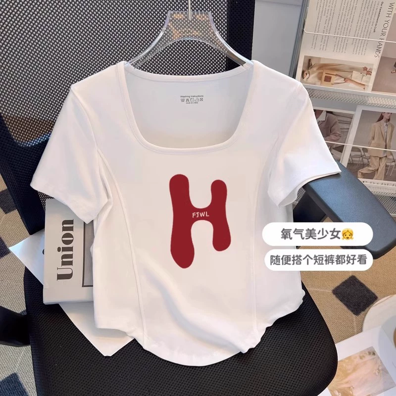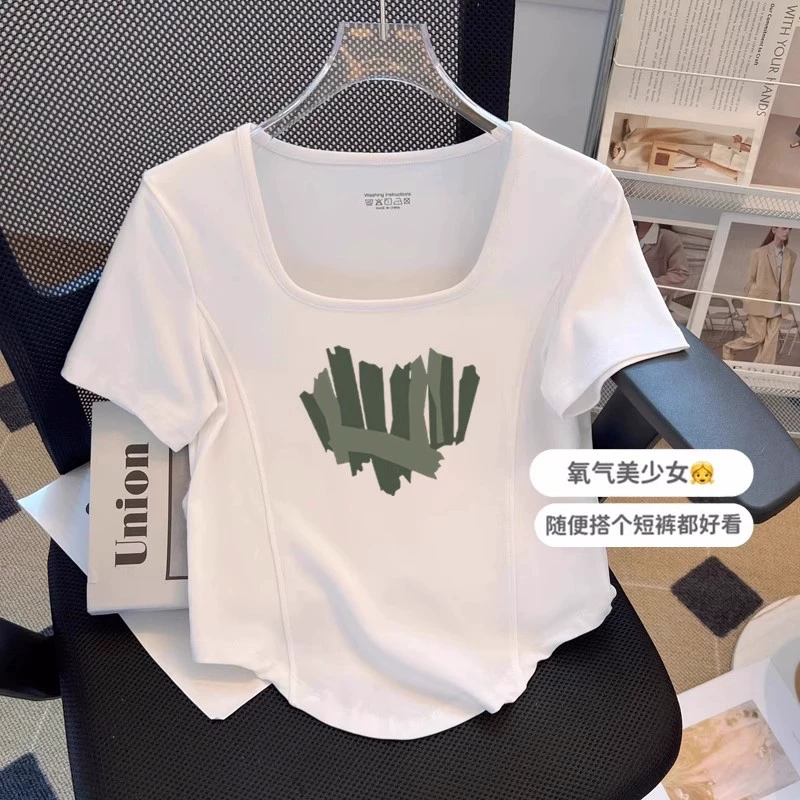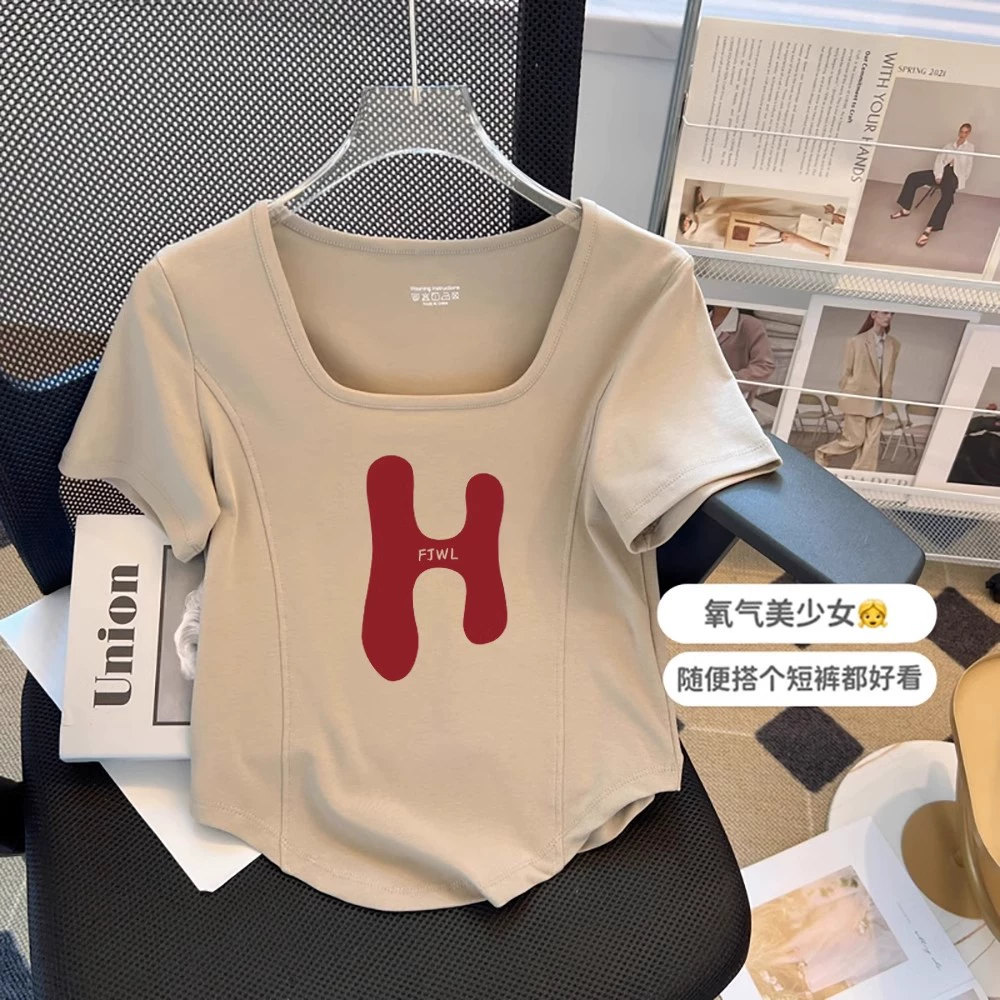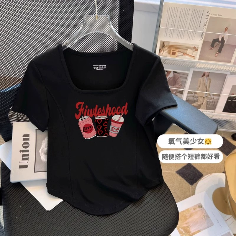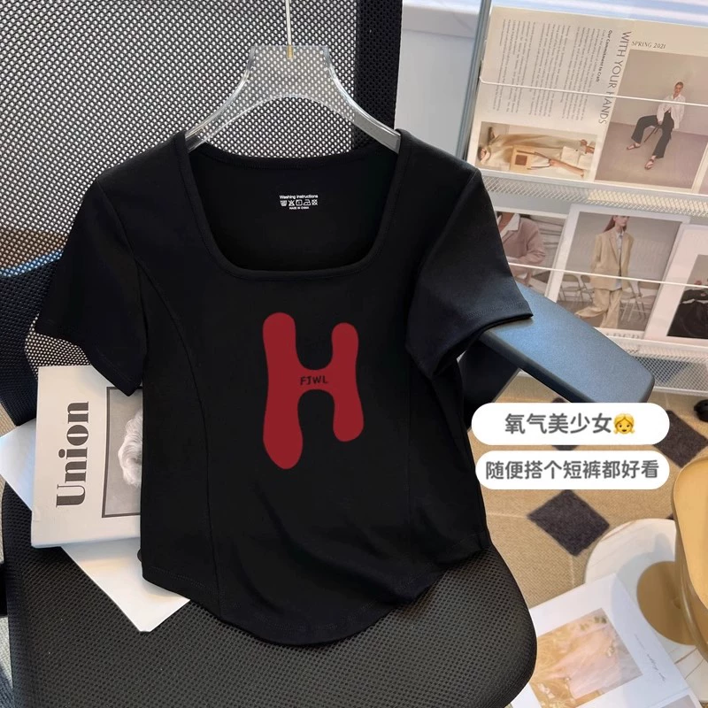 | nameOriginal | Fashionable square collar exposed collarbone waist ins short sleeve t-shirt |