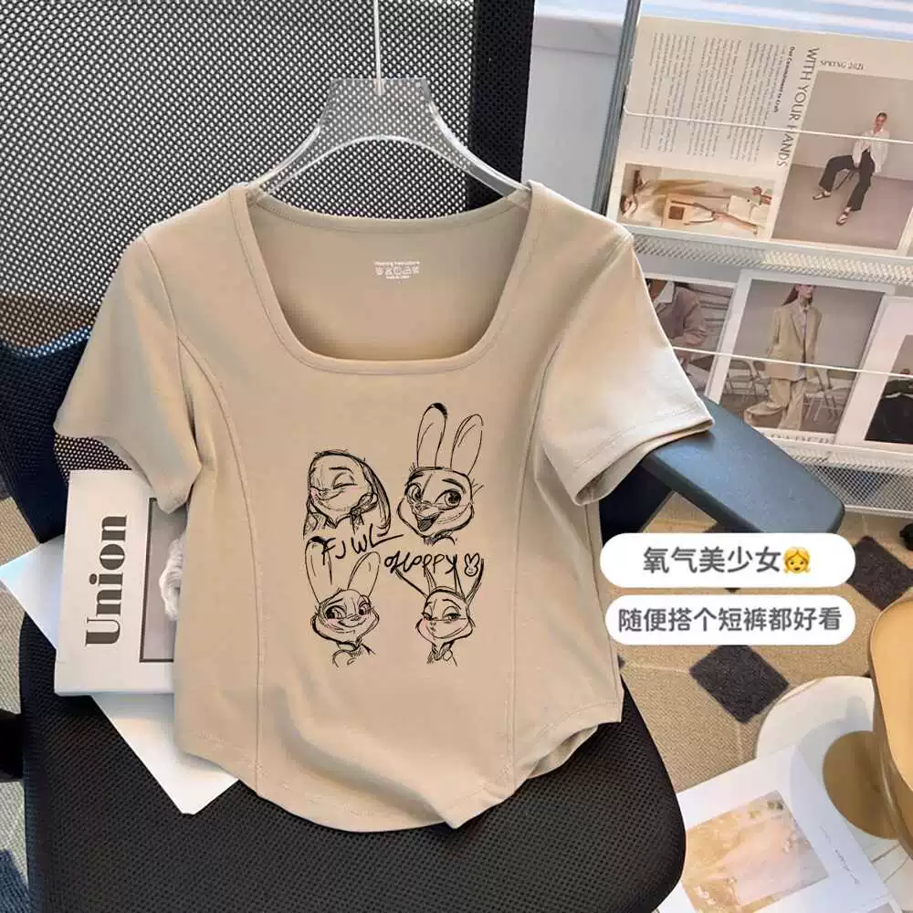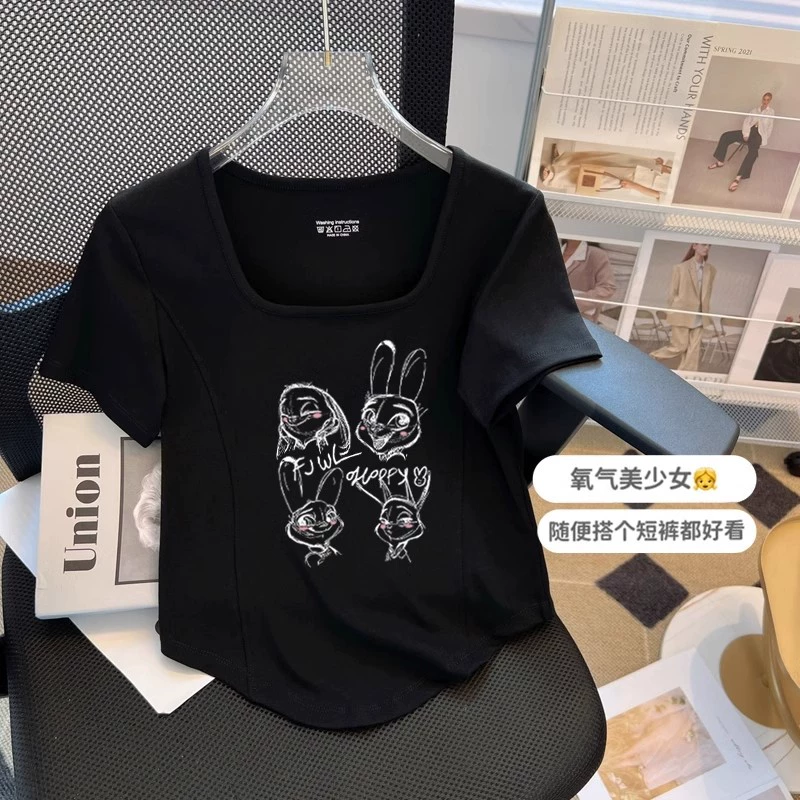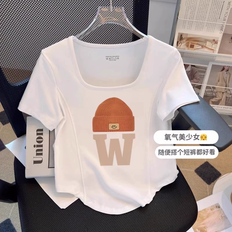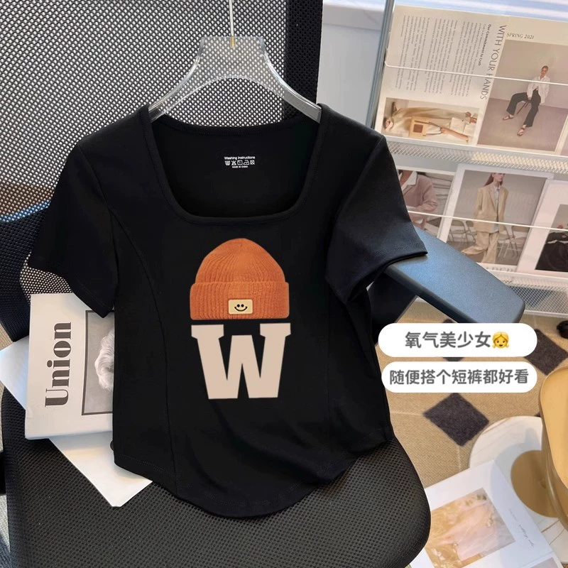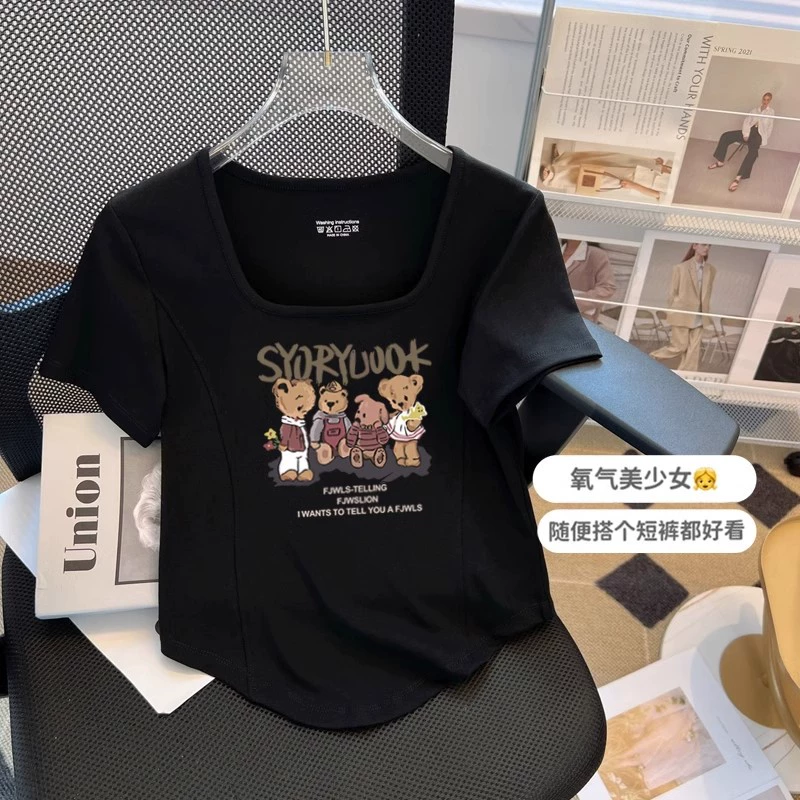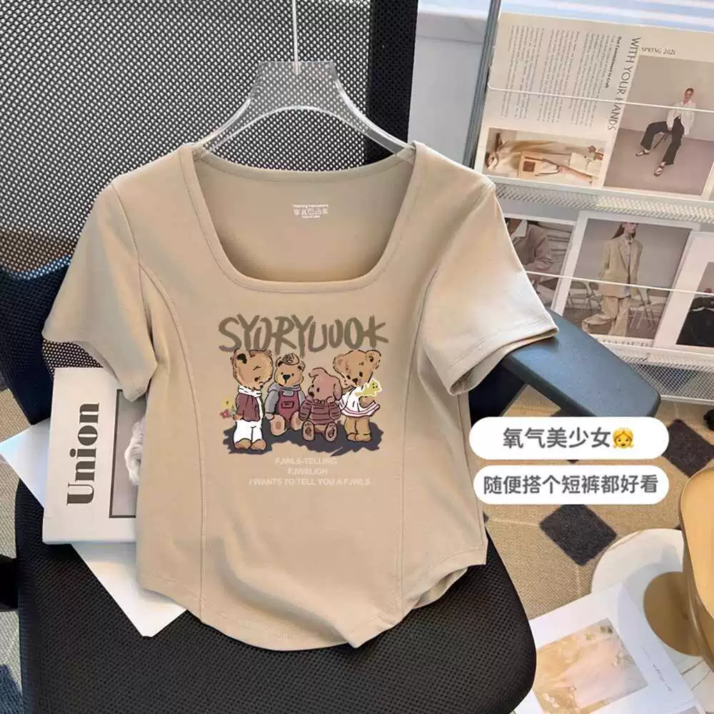 | nameOriginal | Fashionable square collar exposed collarbone waist ins short sleeve t-shirt |
