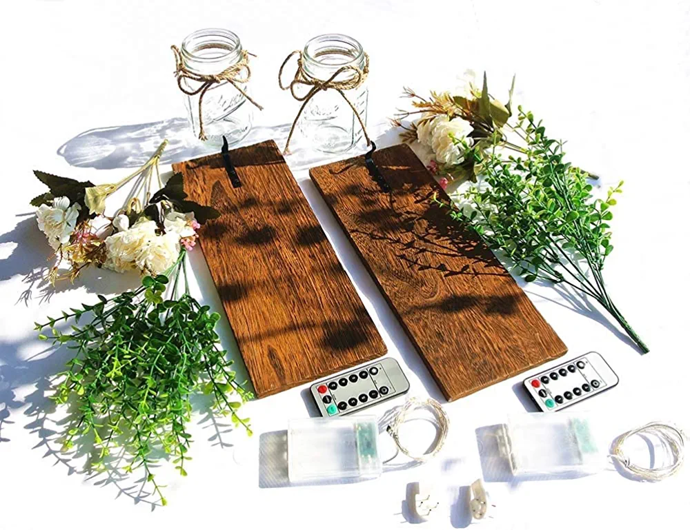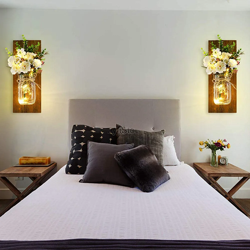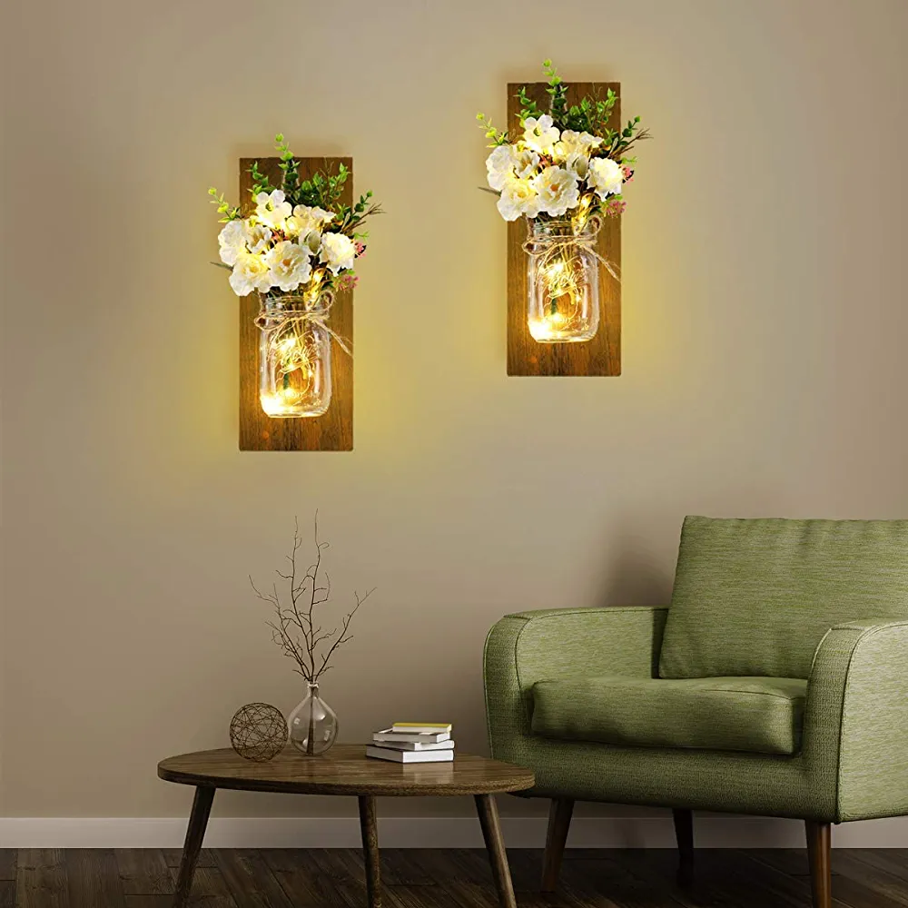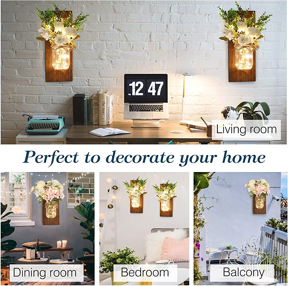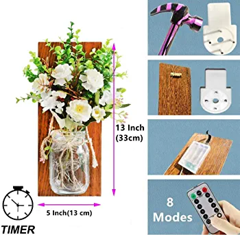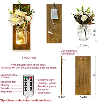 | descriptionOriginal | RUSTIC HOME DECOR An ideal gift option for your family members, friends, colleagues, bosses, business partners, relatives, etc. Send your beautiful wishes to them at an important moment or on a special day. Sweet Wedding Gift Mason Jar sconce perfect wall decoration for bedroom, living room, kitchen, wedding, party, hallway, garden. 2*Mason jar, 2*wooden boards 2*White Peony with Eucaly, 2*led strip lights wall decor dining room decor wall decor living room kitchen decorations Hallway decoration Timer Function Wall lamps with 6-hours timing and remote control function, they can be automatically on and off after using the remote control settings. |