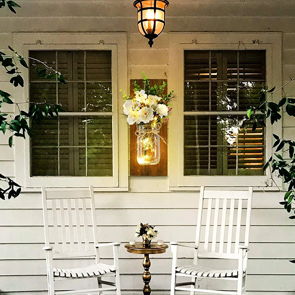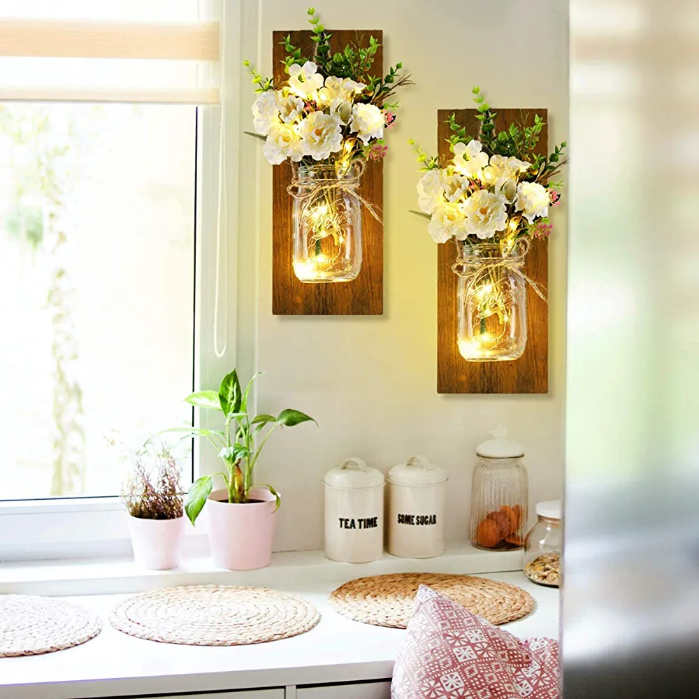 | nameOriginal | BENLETT Rustic Wall Sconces Mason Jar Sconces Handmade Wall Art Hanging Design with Remote Control LED Fairy Lights and White Peony,Farmhouse Kitchen Decorations Wall Home Decor Living Room Lights |