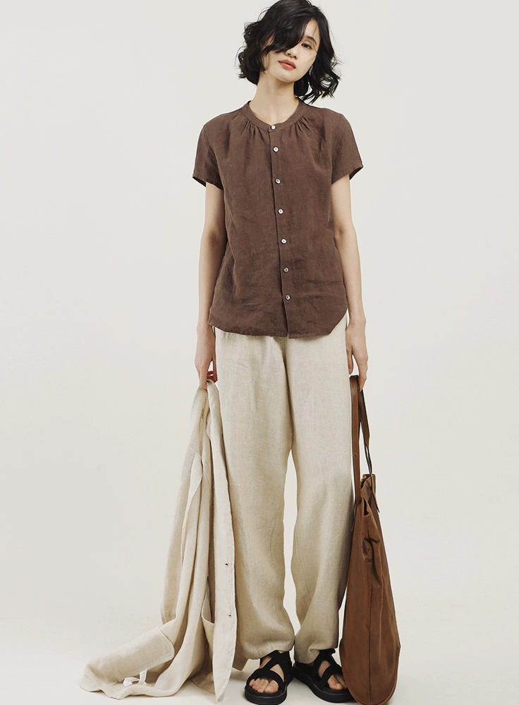 Cotton and linen summer small stand collar Chinese style literary short-sleeved shirt