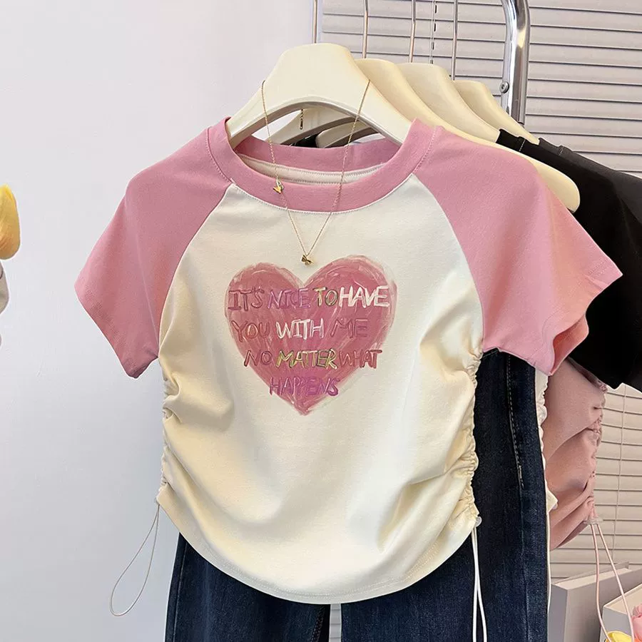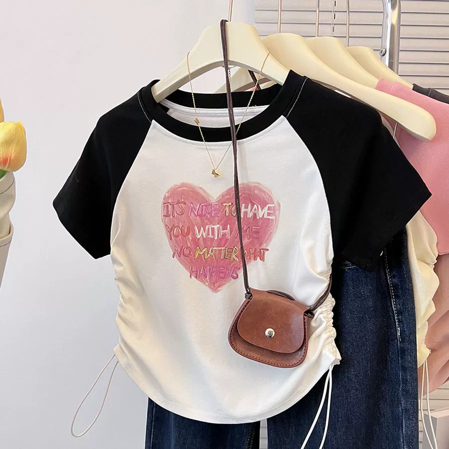 | nameOriginal | American retro love printed short-sleeved T-shirt for women 2024 summer right shoulder slim fit girls short raglan sleeve top |