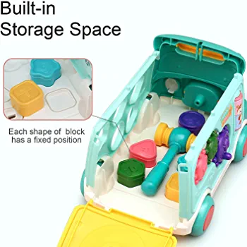 The front of the bus toy has a rope for kids to pull and push, providing endless fun and entertainment. The back door of the bus can be opened to store blocks and hammers, helping to develop good organizing habits.