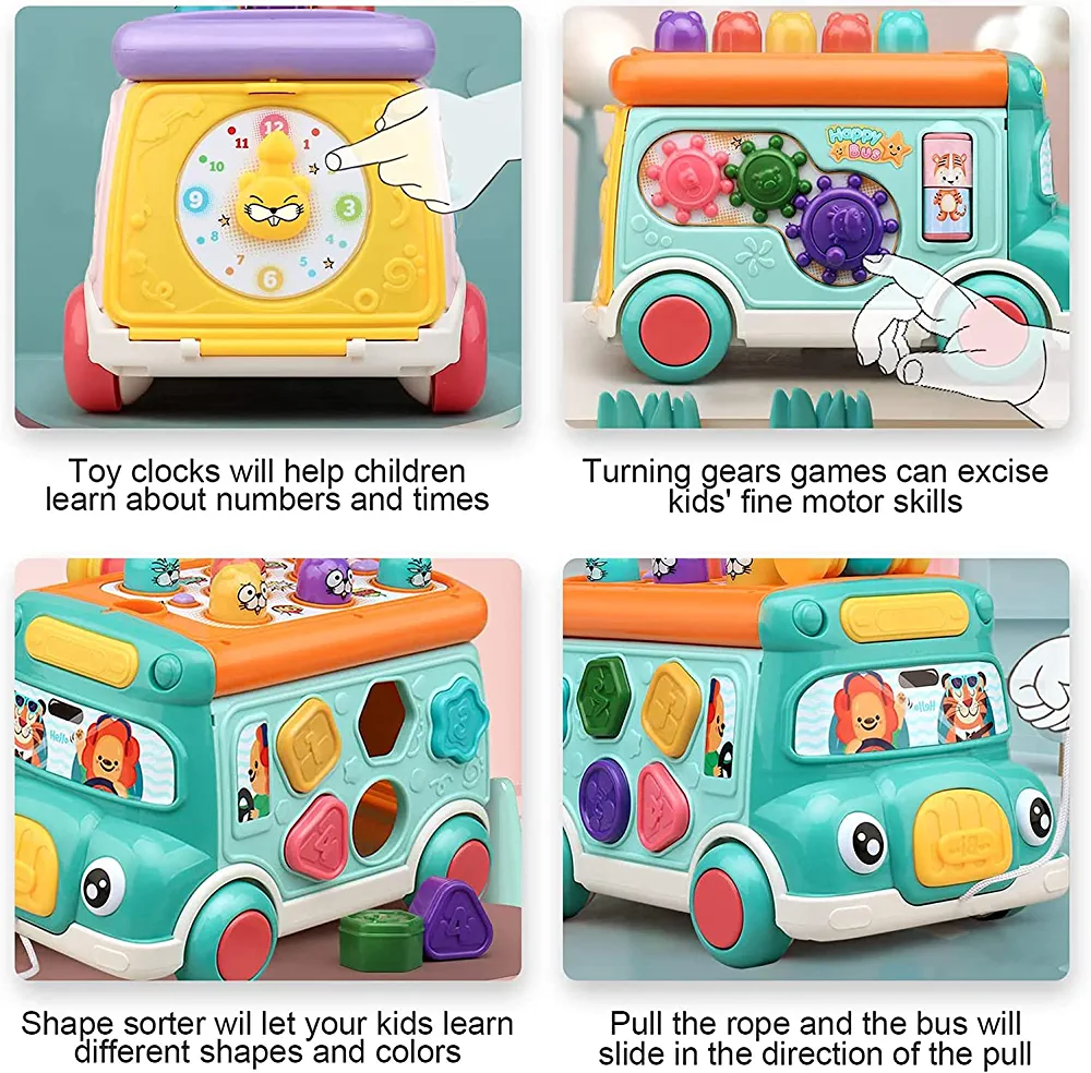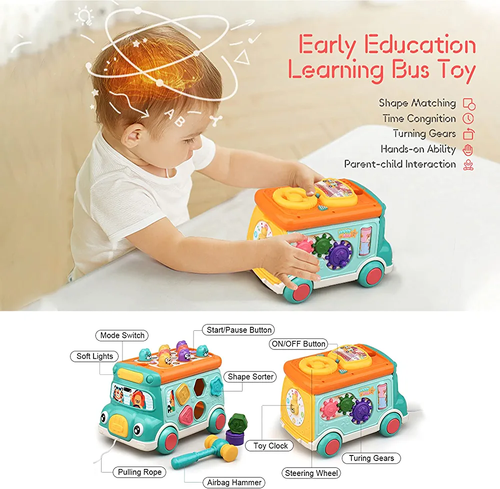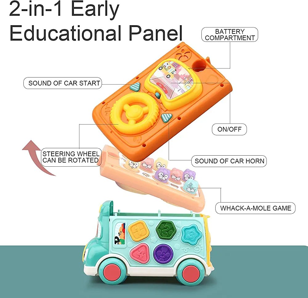 This interactive toy school bus offers a variety of modes to keep your child entertained and learning. The Whack-a-mole panel has 8 different modes, including Whack-a-mole, Learning, Animal, Instrument, Note, Music, Play, and Drum Set. Each mode offers different early education content, such as animal sounds, songs, notes, and musical instruments.