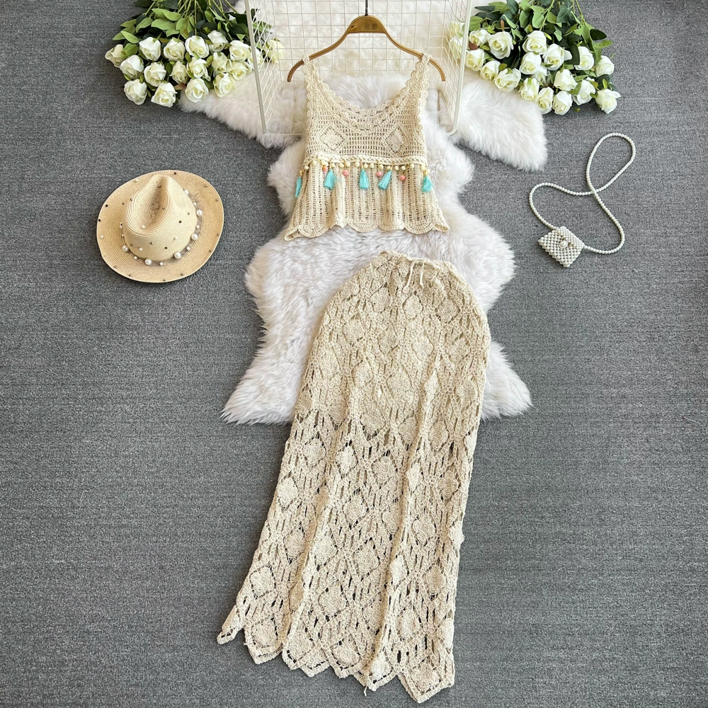 | nameOriginal | Bohemian travel resort style summer suspender short crocheted hollow vest mid-length skirt two-piece set |