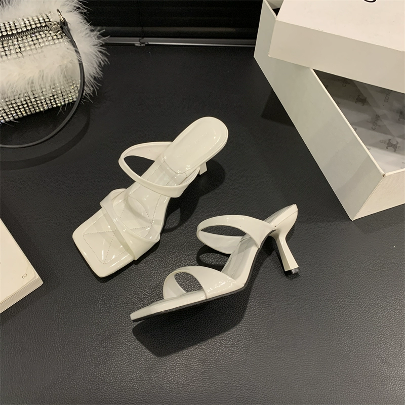 Internet celebrity high-heeled sandals for women to wear outside 2024 summer new sexy square toe open toe black one-line strap stiletto sandals
