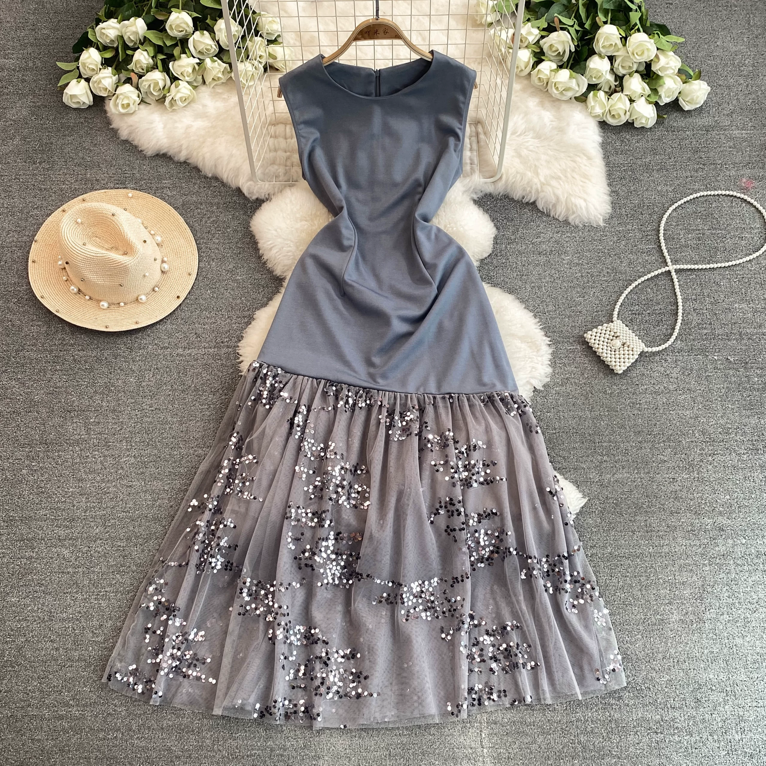 French fake two-piece sleeveless vest dress for women 2024 summer fine sequined a-line skirt ladylike long skirt