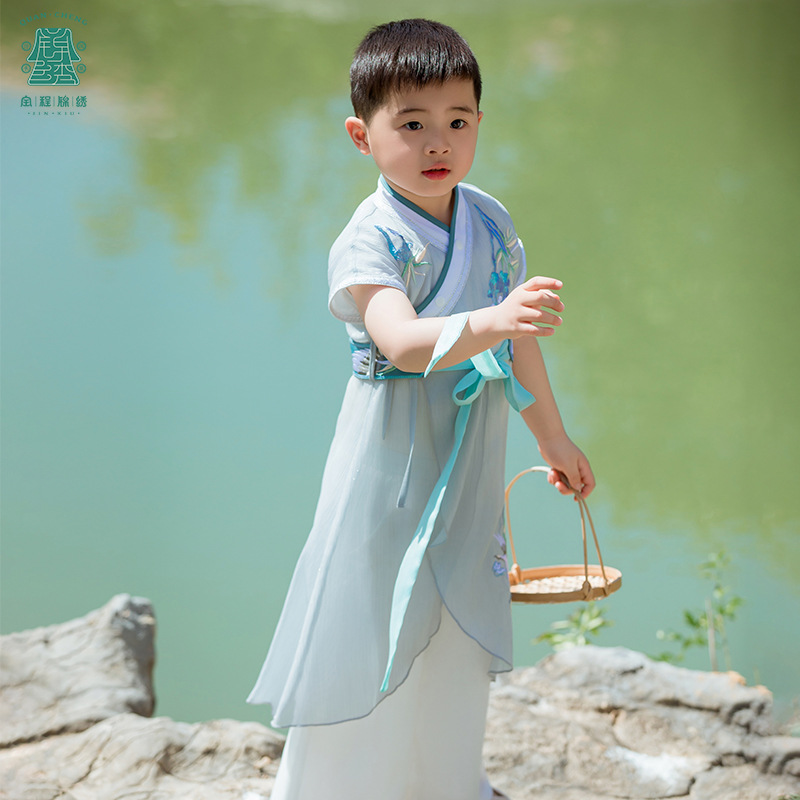 2024 Summer Original Children’s Tang Style Handover Collar Hanfu Improved Guofeng Children’s Wear Boys Short-sleeved Two-piece Set Wholesale