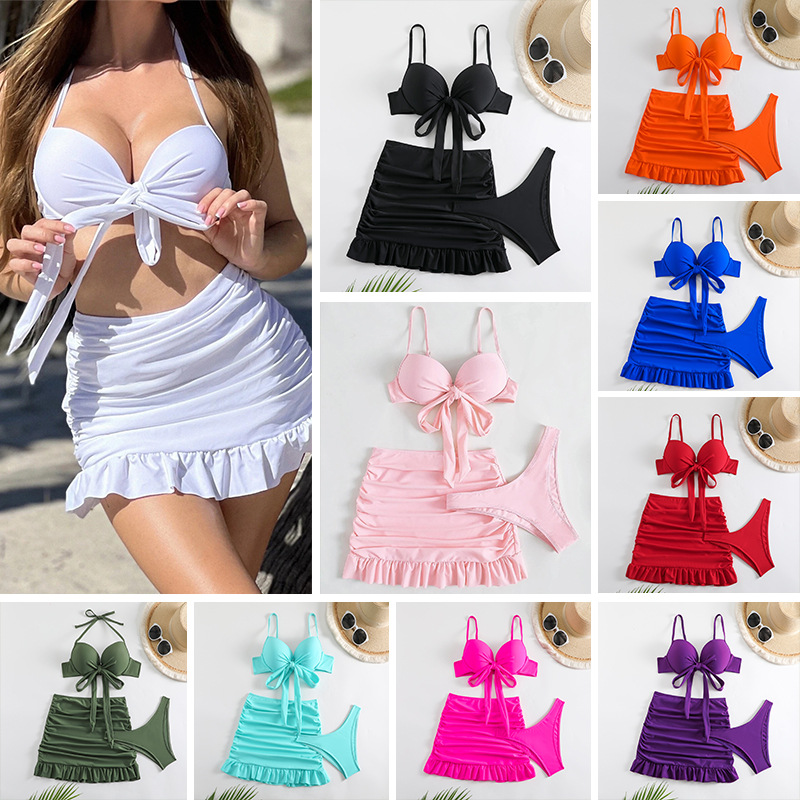 2024 New European and American Split Swimsuit Women’s Sexy Solid Color Hard Bag Bikini Lace-up High Waist Skirt Hot Spring Swimsuit