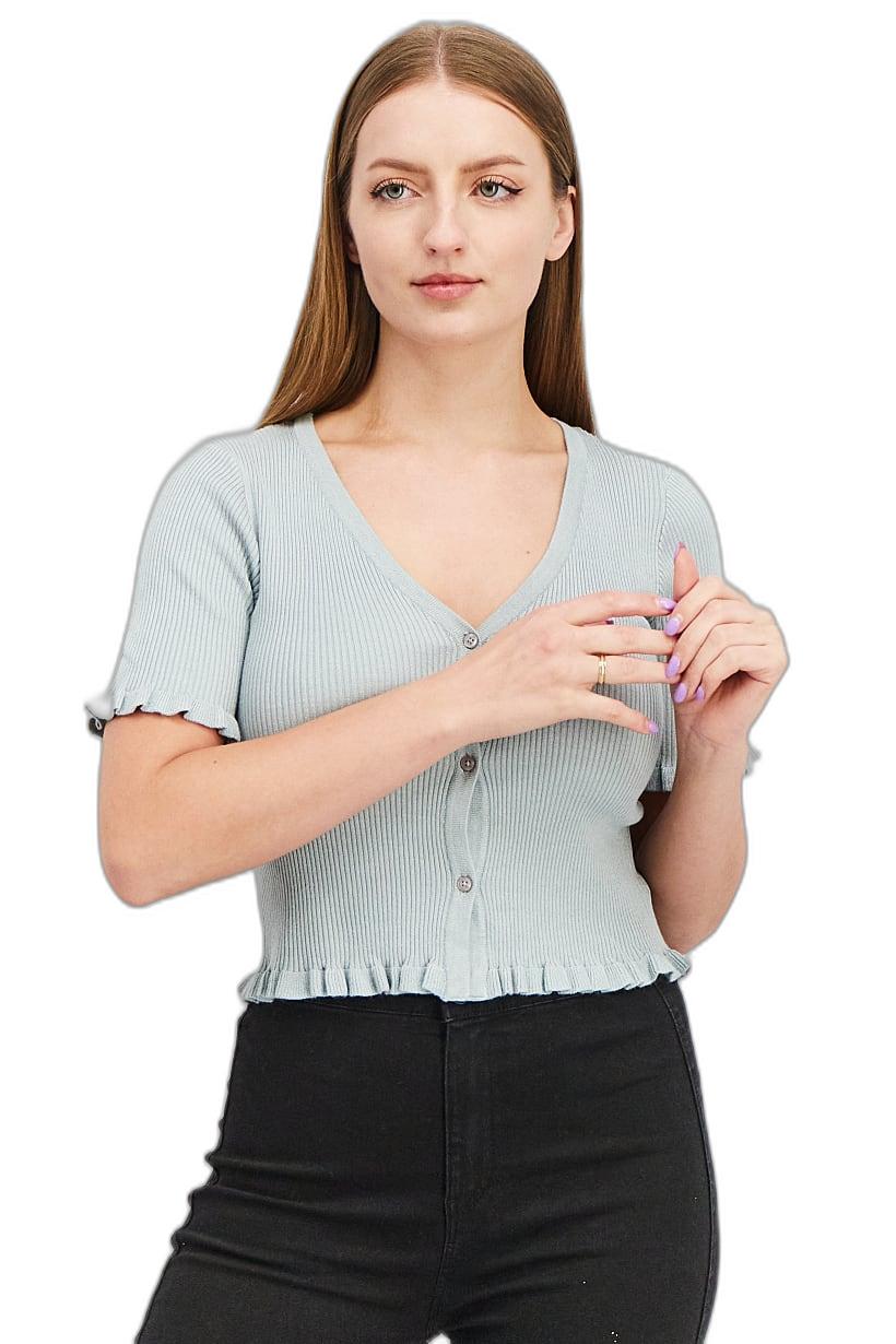Grey Ribbed Crop Top with V-Neck and Short Sleeves for Women.