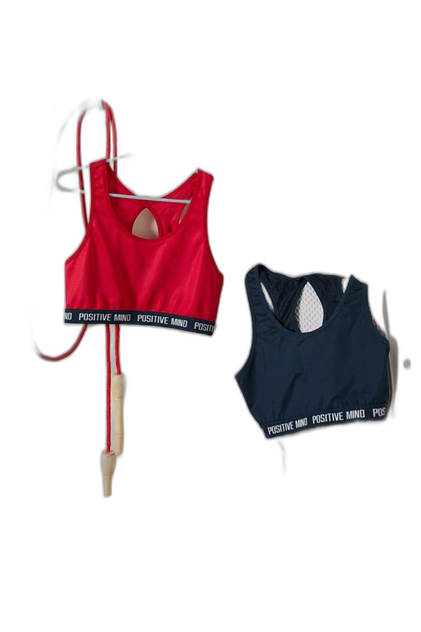 Navy Embroidered Sports Bra Set for Girls with White and Red Accents.