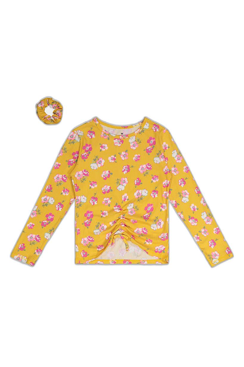 Mustard Cheer Floral Print Top with Scrunchies Set for Girls with Long Sleeves.