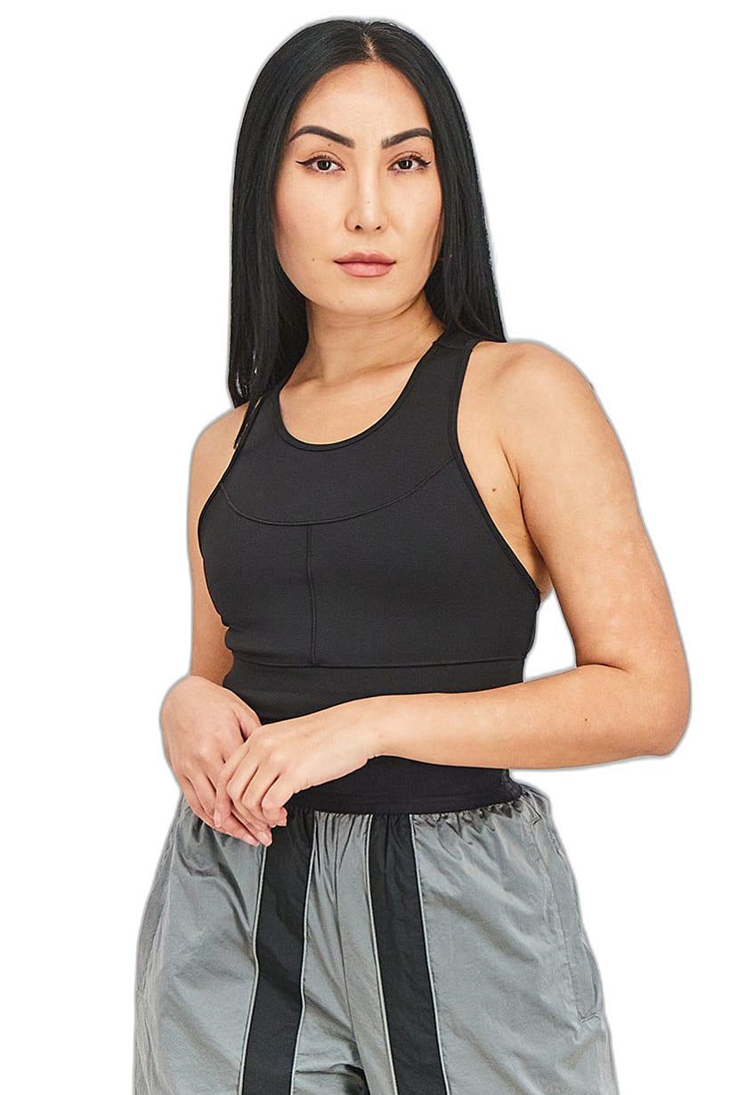 Black Non-Padded Sports Bra for Women’s Fitness with Brand Logo.