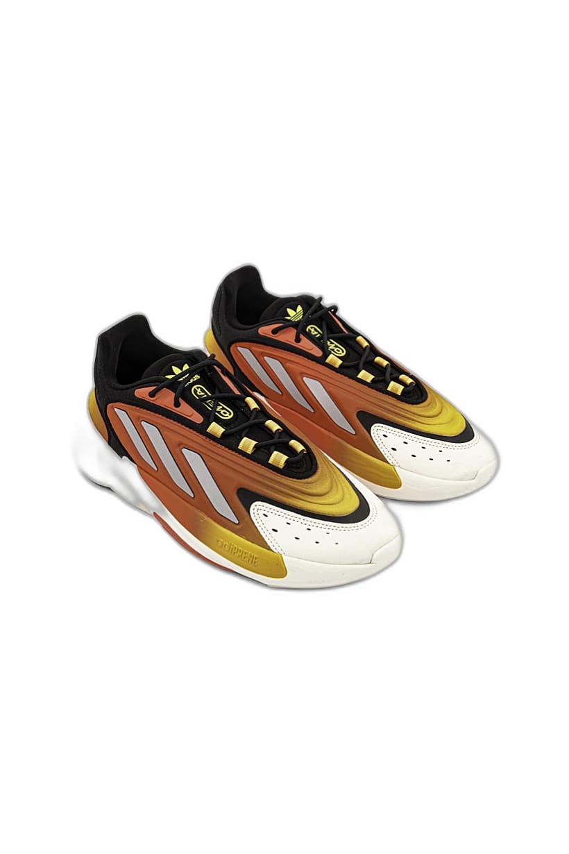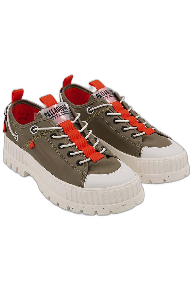 Low-cut sneakers in dark olive and orange, suitable for both men and women.