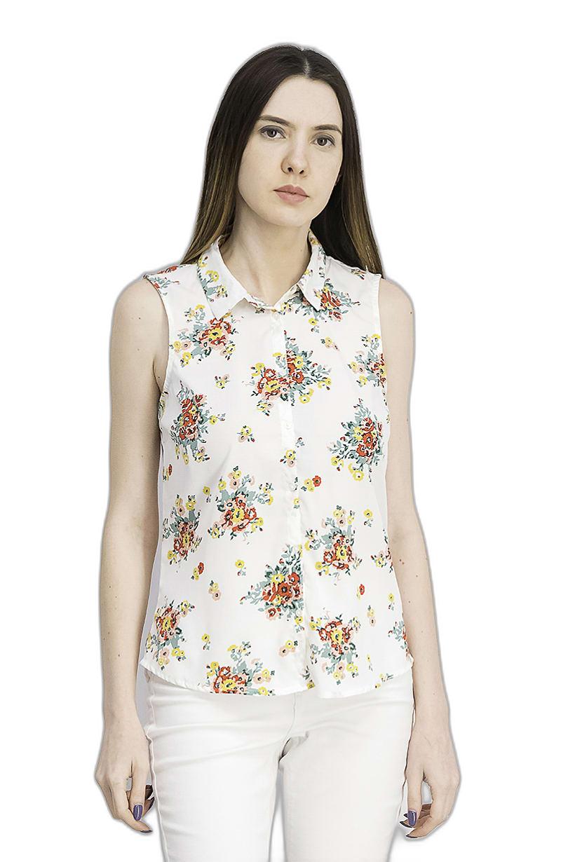 Sleeveless Floral Top with Button Down for Women in White Combo.