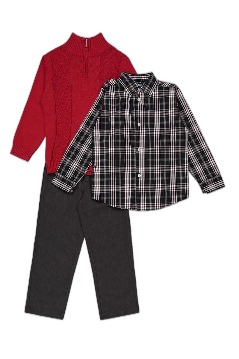 Boys’ 3-Piece Textured Top and Pull-On Bottom Set in Red, Black, and Grey.