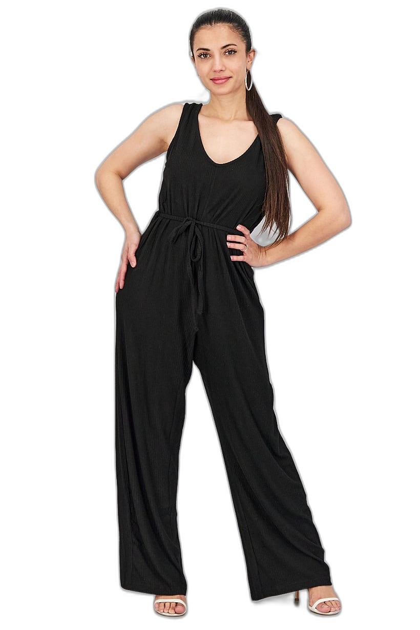 Black Sleeveless Ribbed Jumpsuit with V-Neck for Women.