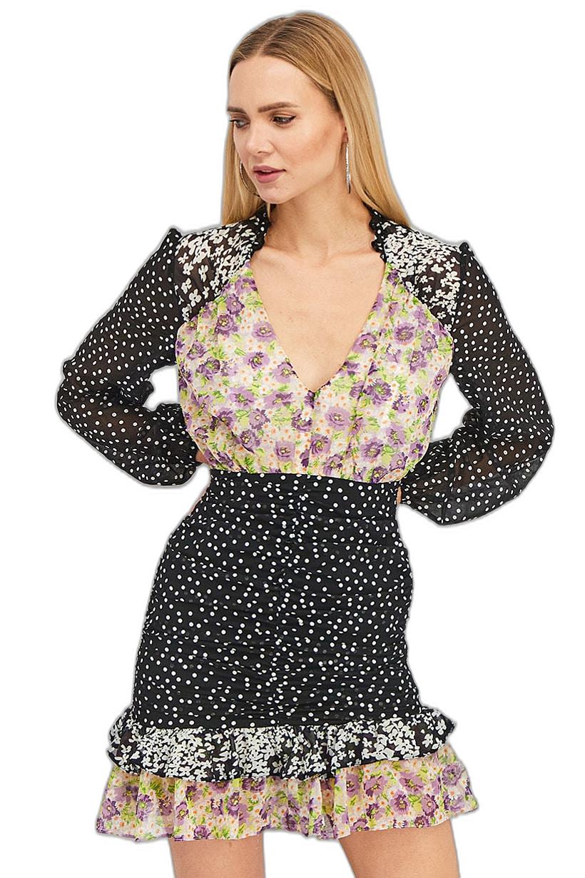 Black Combo Mini Dress with All-Over Print for Women.