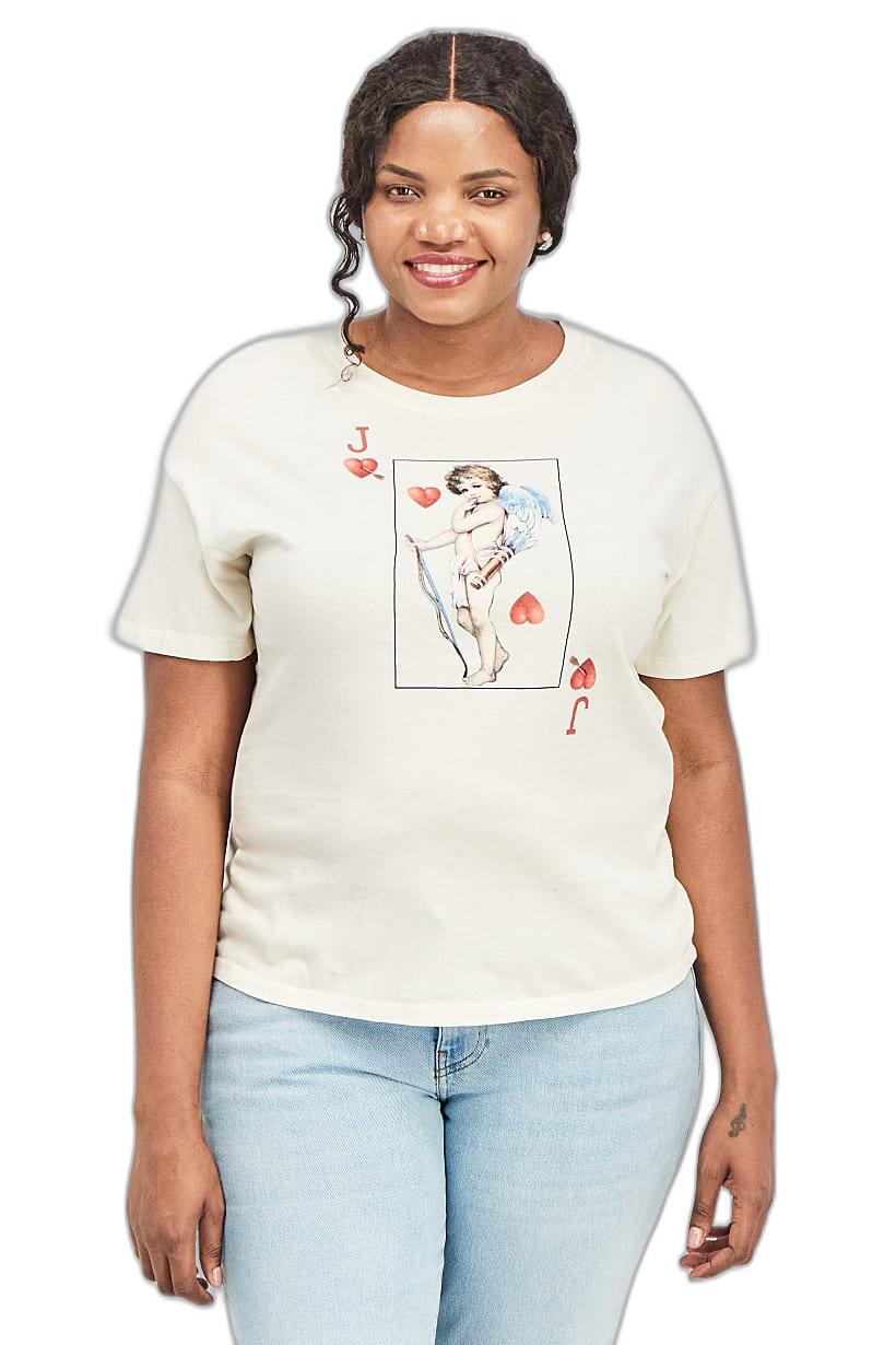 Cream Combo Graphic Print T-Shirt for Plus Size Women with Short Sleeves and Crew Neck.
