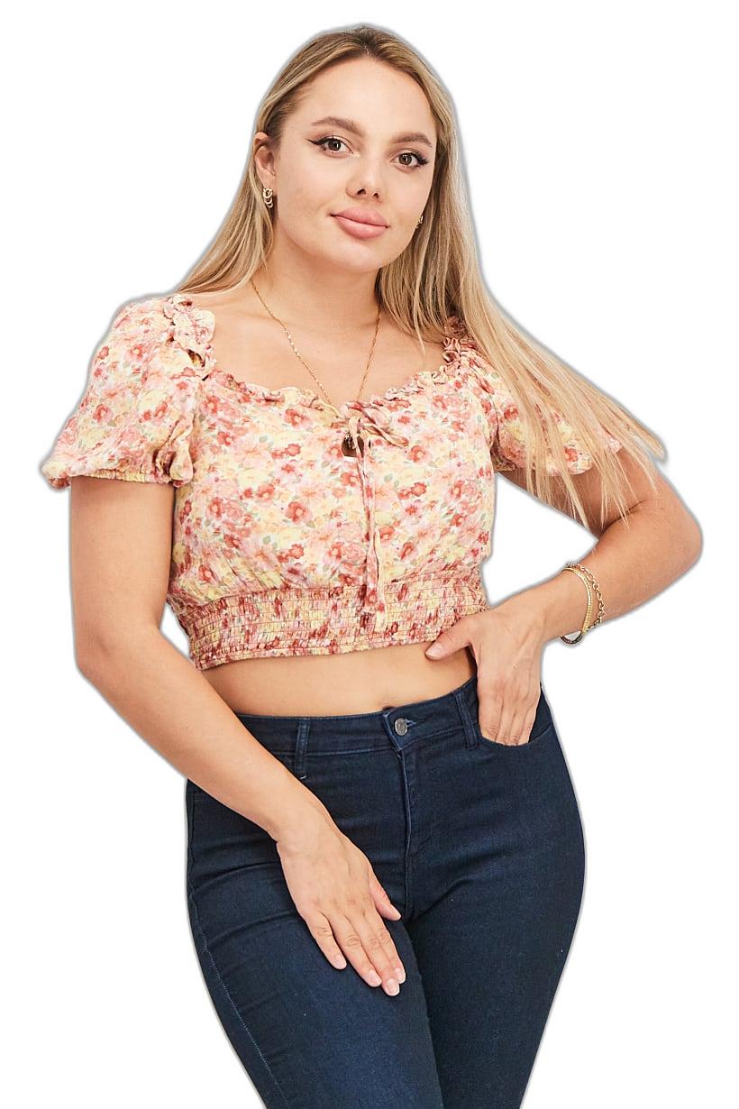 Pink Combo Crop Top with Puffed Sleeves and Allover Print for Women.