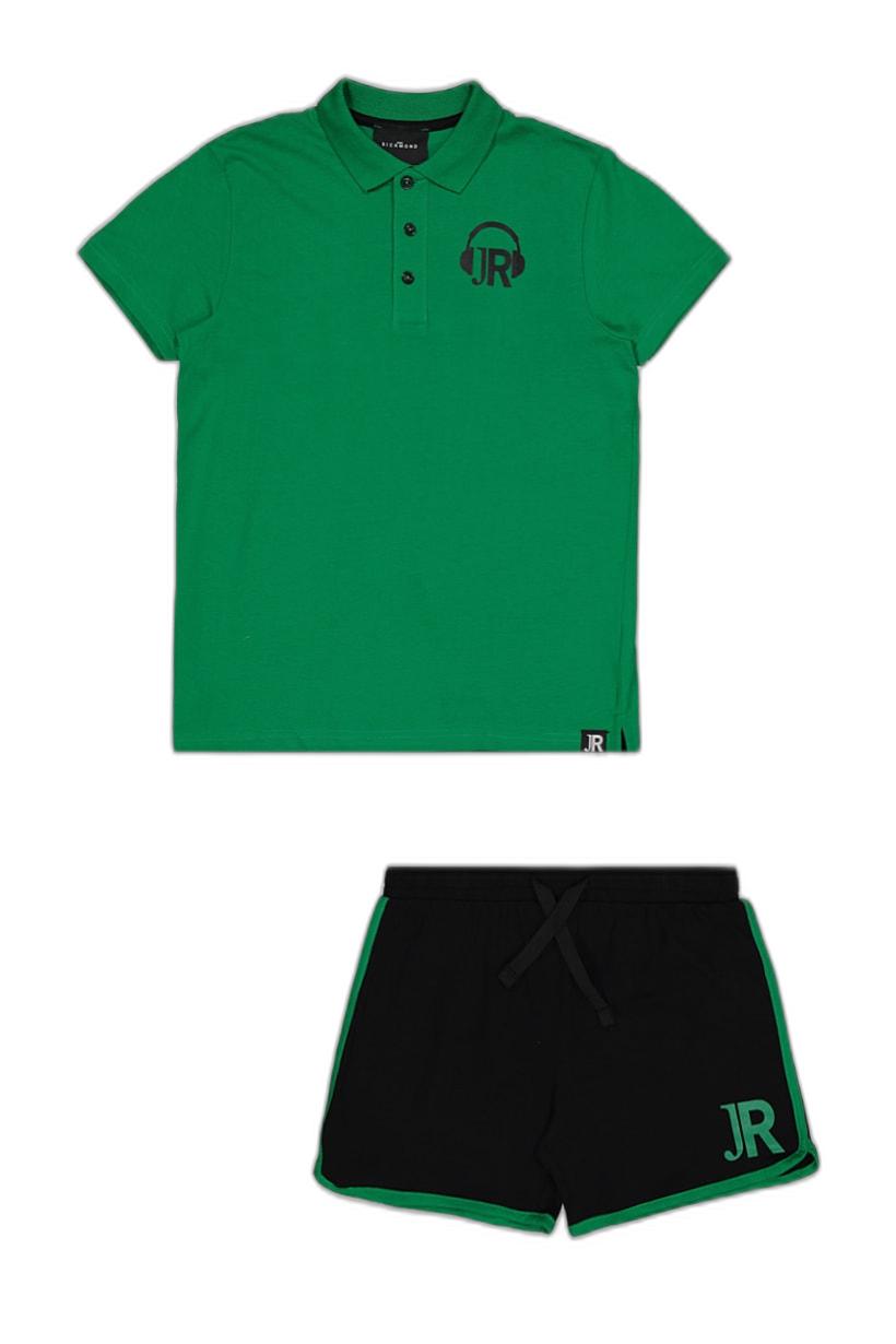 Green and black polo shirt and short set with brand logo for boys.