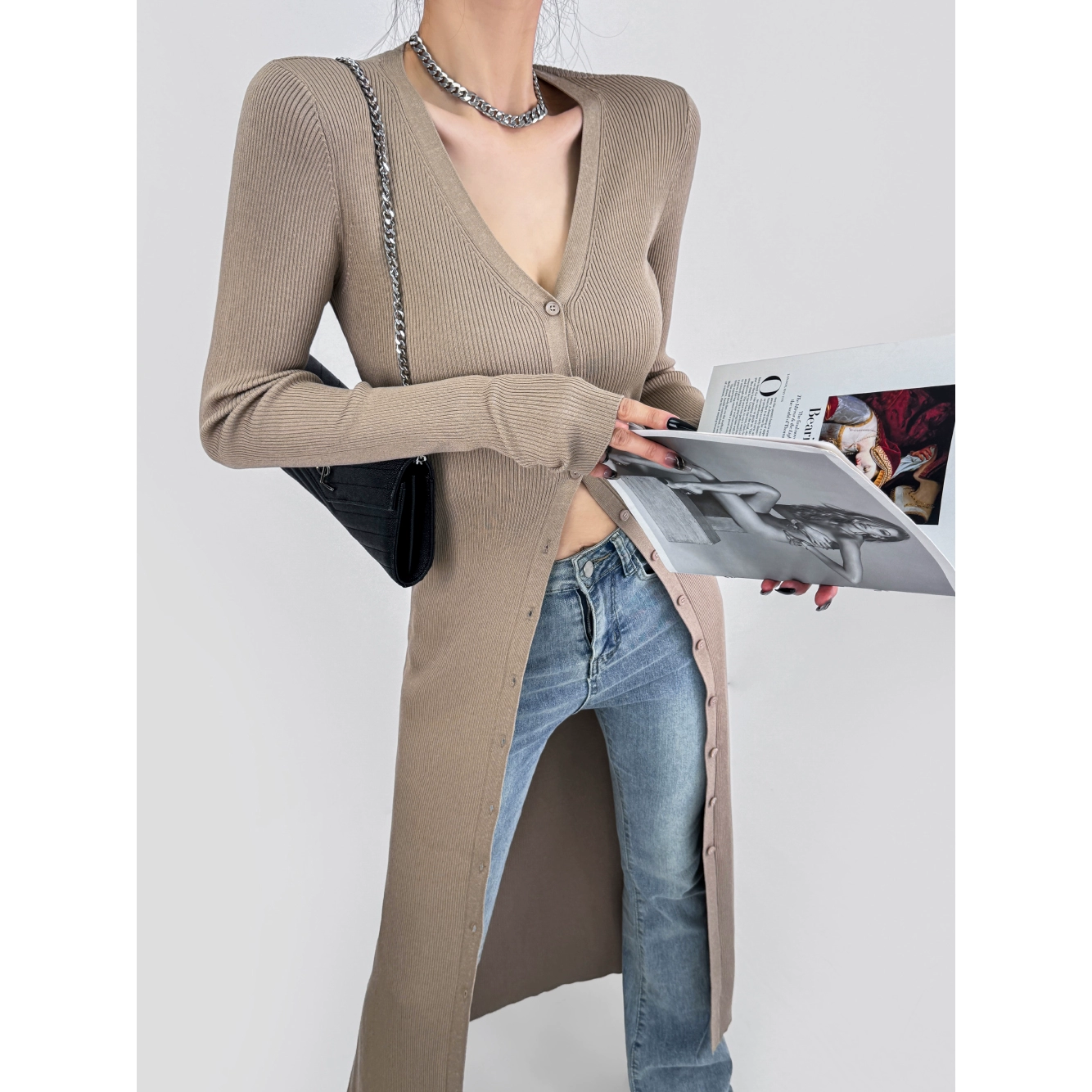 Early spring knitted cardigan covering the hips with V-neck slimming paper figure