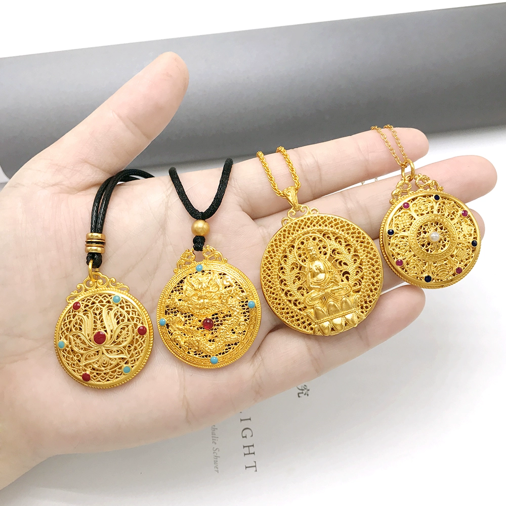 Vietnamese sand gold necklace pendant women’s ethnic style round card pendant knitted sweater chain gold-plated Buddha peace buckle pendant