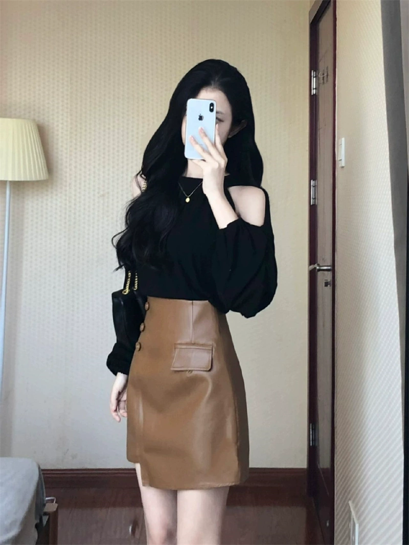 Off-the-shoulder high-end Yujie coffee-colored leather skirt early autumn top