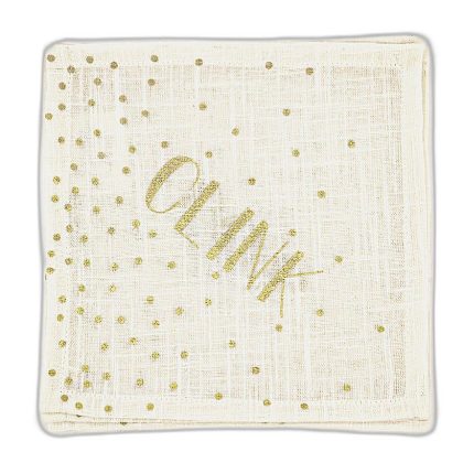 Gift set of beige cocktail napkins and bottle stopper with "Pop Fizz Clink Yay" design. Measures 28 L x 28 W. |