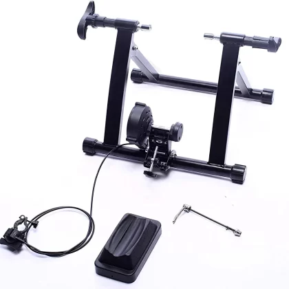 Steel bike exercise stand with magnetic resistance and front wheel riser block by BalanceFrom. |