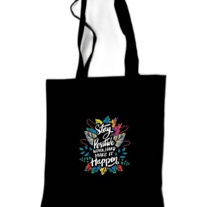 Eco-friendly Black Cotton Tote Bag with Positive Message. |