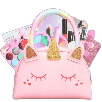 Safe and washable makeup set for kids with real cosmetic case, perfect for pretend play and birthday gifts. |