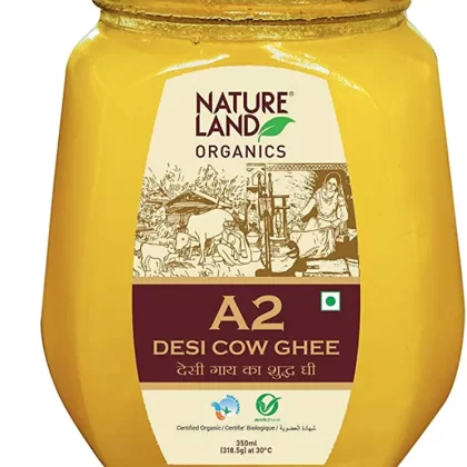 Organic A2 Cow Ghee in a 350ml glass bottle by Nature Land. |