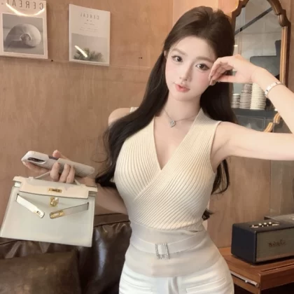 Cross apricot v-neck knitted slim sleeveless sling |