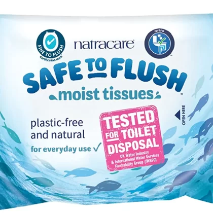 Flushable Natracare Moist Tissues with Aloe Vera and Witch Hazel (30 wipes) made of 100% paper and organic formula. Sewer safe. |