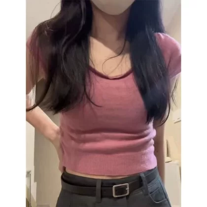 Pure lustful style, sweet and spicy U-neck short-sleeved T-shirt for women, summer design, niche slim fit, slim waist, hot girl short top |