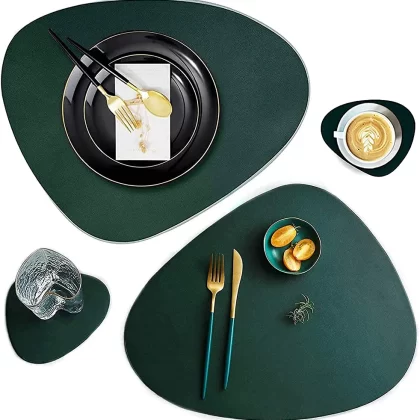 Set of 4 round faux leather placemats with 2 coasters. Heat resistant, non-slip, washable, and perfect for dining tables. Features a Nordic style design. |