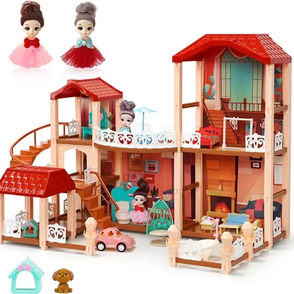 Dollhouse kit with 8 rooms, 2 balconies, 2 dolls, pet dog, car, furniture, and accessories. Ideal gift for kids aged 5-8+. |