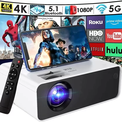 Portable projector with 1080P HD resolution, 5G WiFi, and Bluetooth. Supports up to 200" display for outdoor movies and home theater. Compatible with smartphones, TV sticks, laptops, and more. |