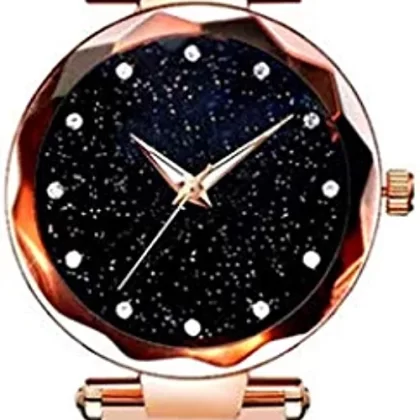 Luxury women's watch with sky dial, quartz movement, magnetic mesh strap, and waterproof design. |
